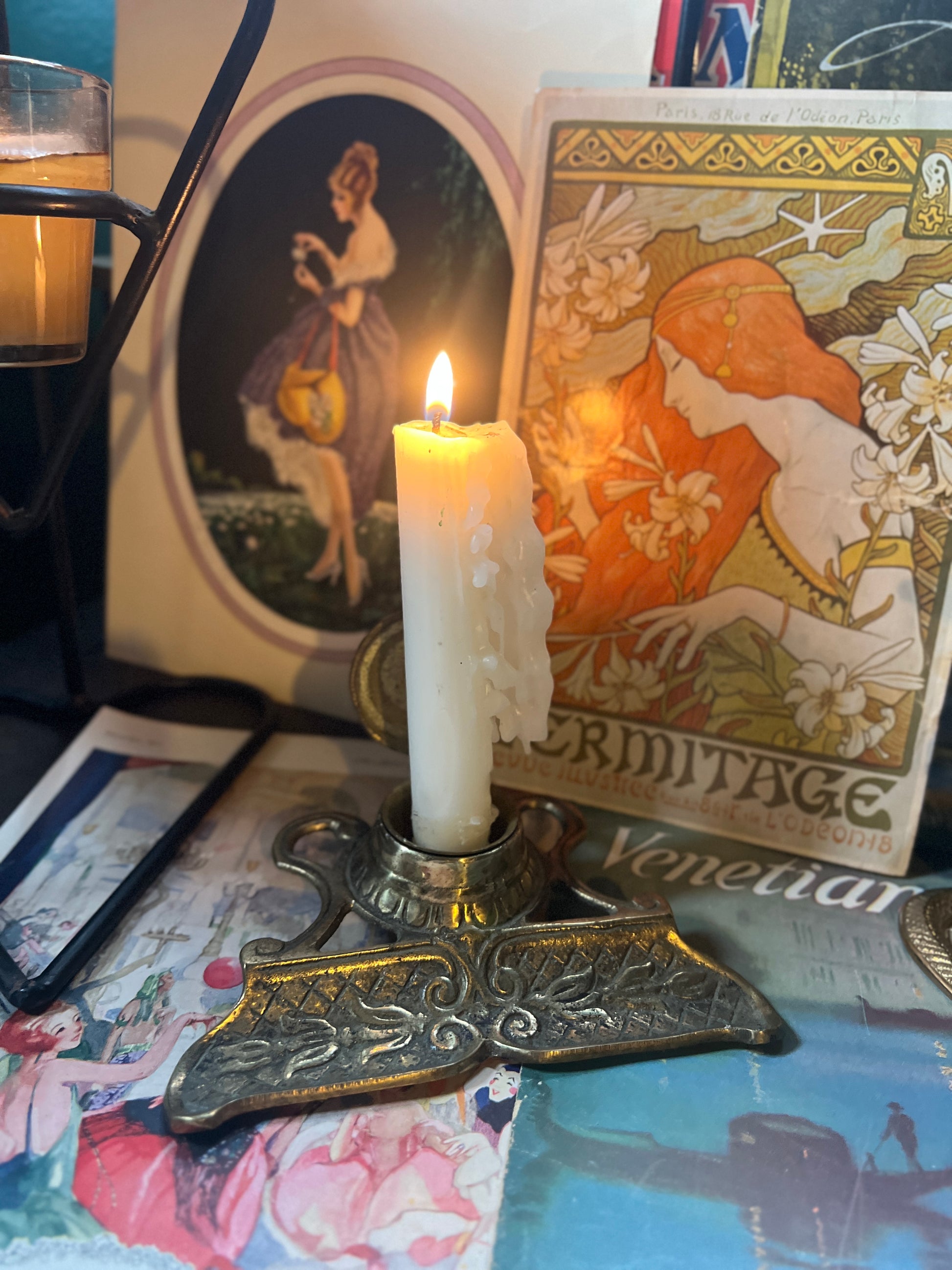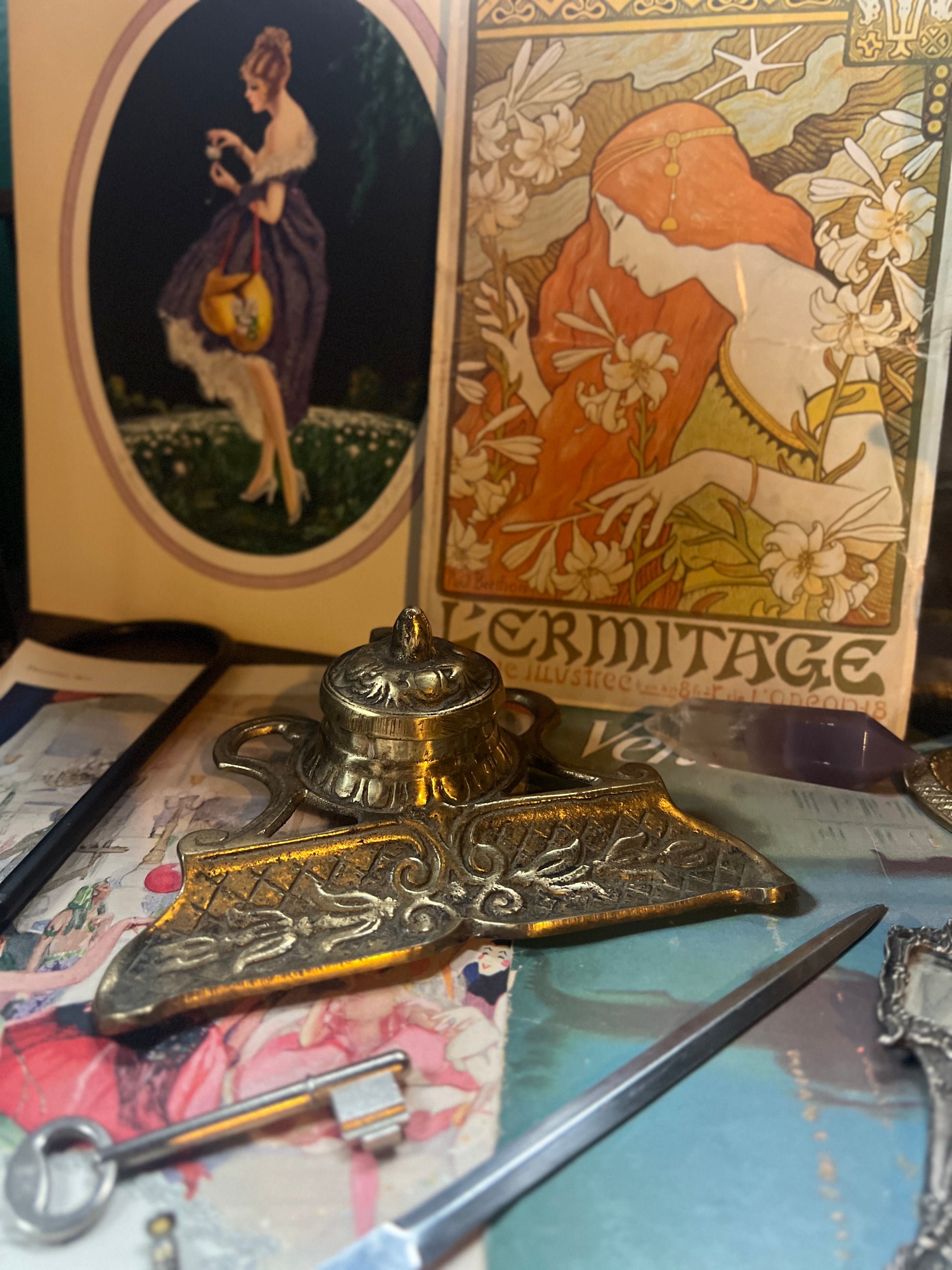 Gorgeous single solid brass inkwell with art nouveau style design