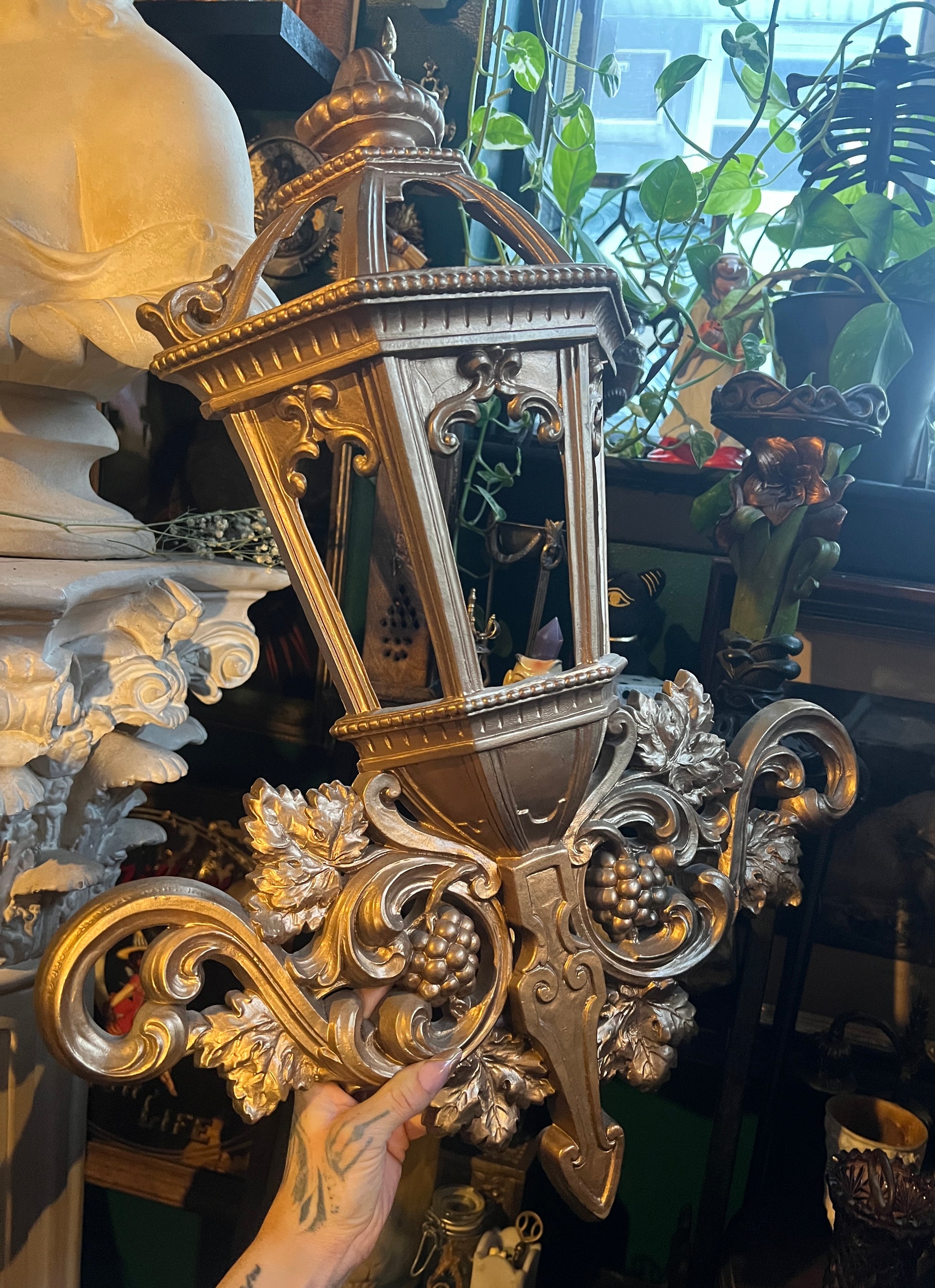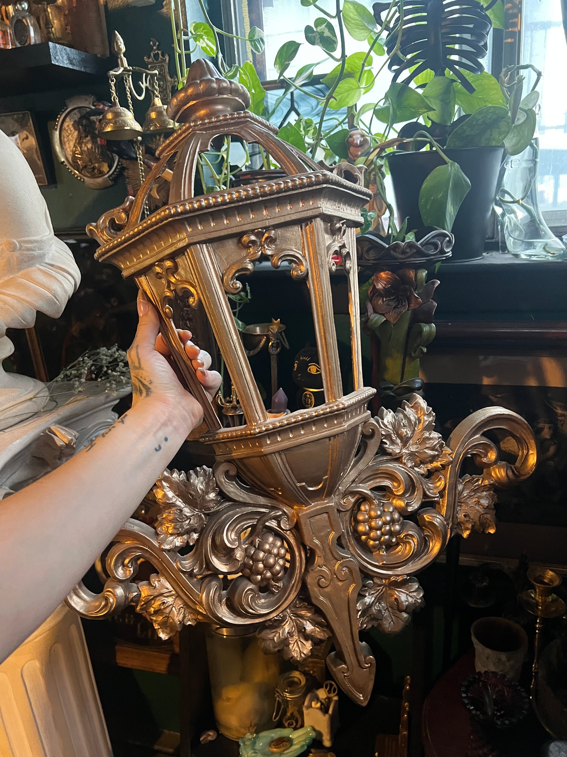 lantern style wall hanging in a gold color with ornate accents and also features a grape and grape leaves accent on the lower portion.